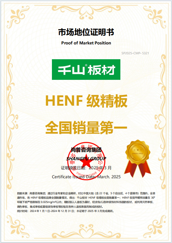 “見山·見未來”千山板材2025全國經(jīng)銷商峰會,尚普咨詢集團(tuán)曹頡先生親臨峰會現(xiàn)場,為千山板材帶來極具分量的權(quán)威認(rèn)證——千山板材HENF級精板全國銷量第一!再次印證了千山板材在環(huán)保家居領(lǐng)域的領(lǐng)先地位。作為中國最具領(lǐng)導(dǎo)力和權(quán)威性的認(rèn)證公司,尚普咨詢是中國最早成立的咨詢公司之一,也是首批取得國家統(tǒng)計(jì)局涉外調(diào)查許可資質(zhì)